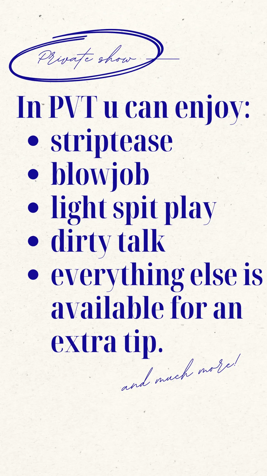 阴部骆驼趾, 下流話, 假阳具或震动器, 快闪裸体, 按摩, 口交, 丝袜, 裙底风光, 情境扮演, 脱衣舞, 赤裸上身, 鞭打, 手淫指导, 大屌评分, 羞辱, 高跟鞋, 狗式, 骑乘女, 电臀舞, 打飞机, 强制塞口, 颜射, 乳胶, 自慰, 足交, 恋足, 高潮脸, 乳头玩具, Squirt+1111tk, 指交, 乳交, 高潮, 骑脸, 精油表演, 色情舞, 性玩具, 紧身内衣, 深喉